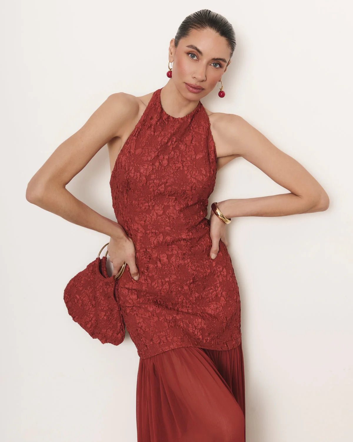 Bolso estilo bombonera, confeccionado en tejido jacquard satinado color rojo fresa. Asas metálicas color dorado.