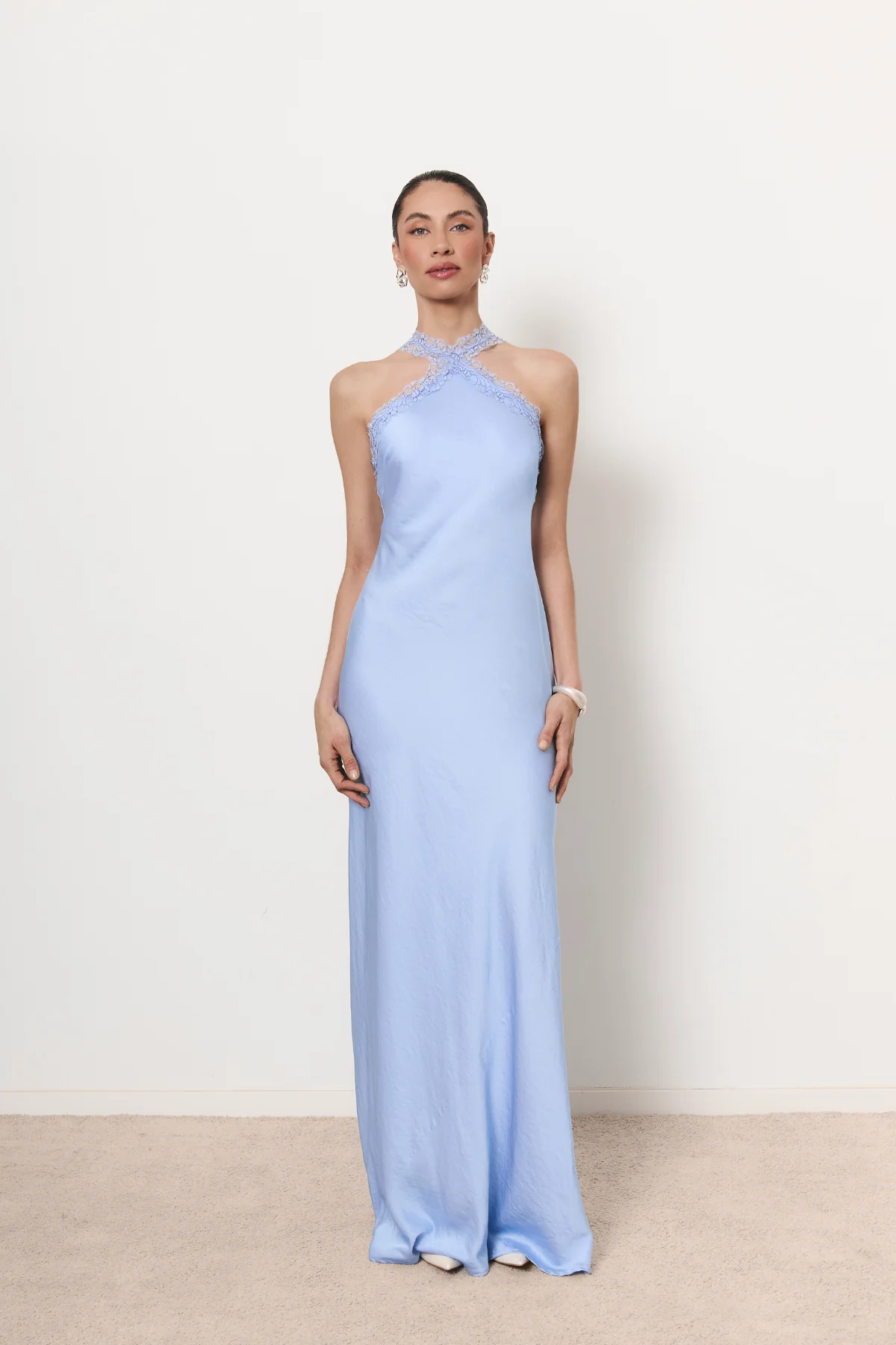 Maxi vestido halter en tono azul bebé y detalles de encaje francés. El vestido tiene uncorte al biés que se ajustará a tu silueta con elegancia. Espalda semi-descubierta y regulable con su lazada posterior.