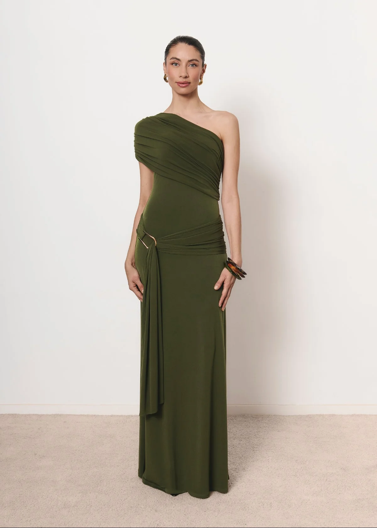 Luce un estilo elegante y actual con este vestido largo en color verde caqui, confeccionado en punto elástico para un ajuste cómodo y favorecedor. El diseño destaca por su hombro asimétrico drapeado y cuerpo ajustado, con un drapeado en la cadera adornado con una pieza metálica. Una propuesta ideal para eventos especiales.