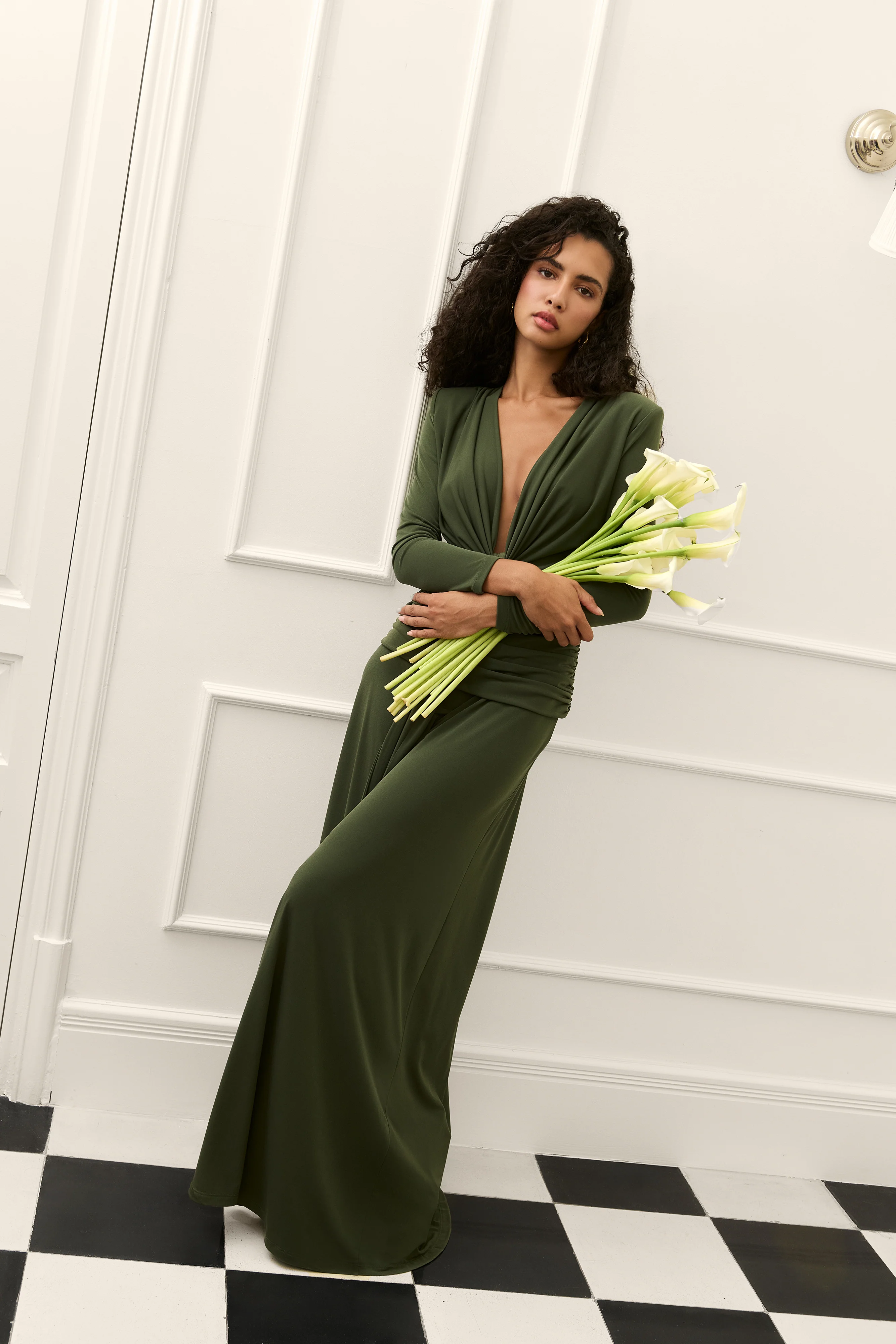 El vestido Rosalie en tono verde caqui es una apuesta sofisticada y versátil para invitadas que buscan un look elevado. Confeccionado en un punto satinado suave, combina un escote drapeado muy favorecedor con hombreras interiores y pliegues en la cadera que estilizan la silueta.